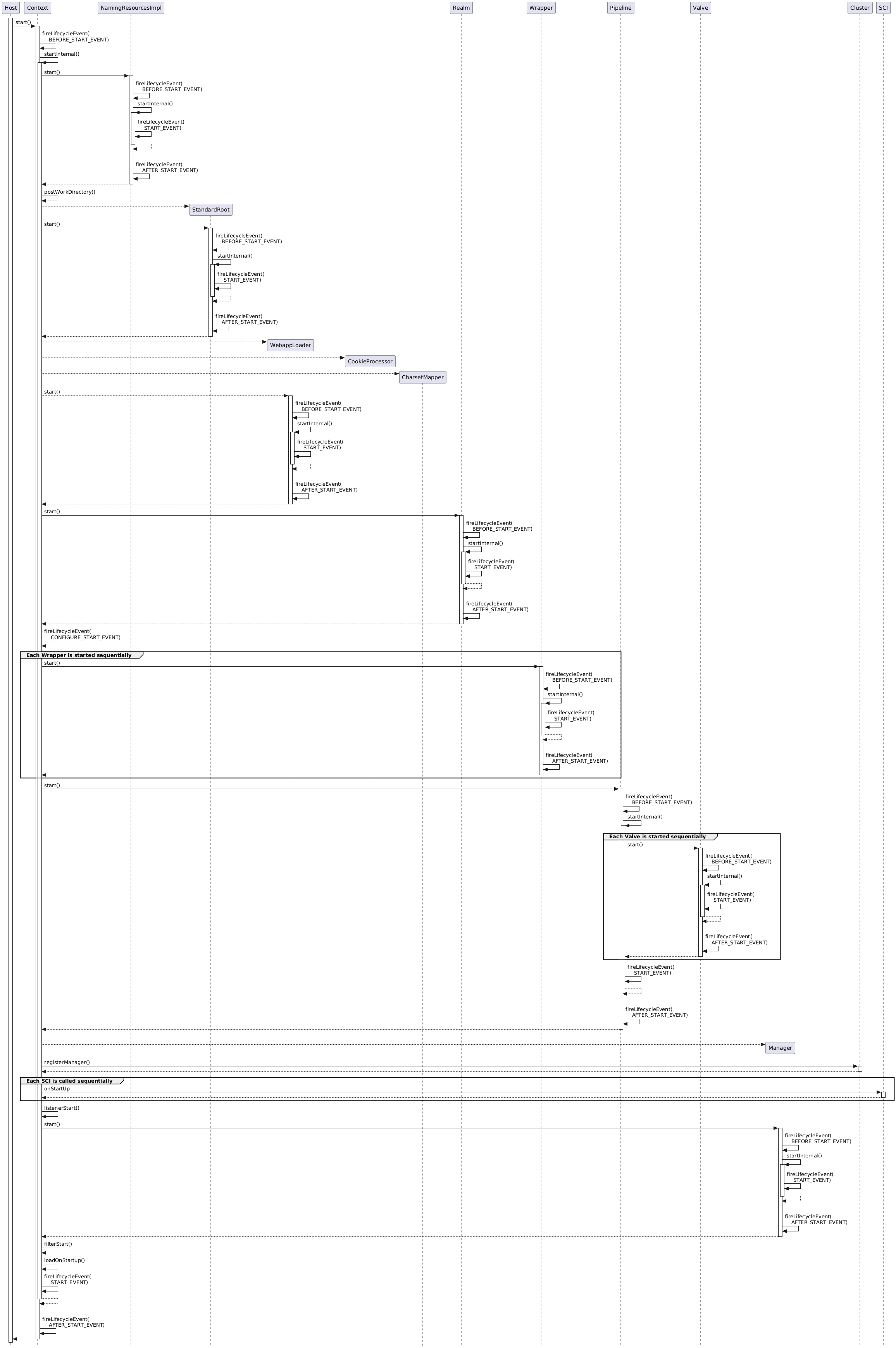 Diagram 3 shows how Tomcat starts the objects created by the Digester that were initialized in the previous step. This diagram also shows when lifecycle events are fired. There is more detail to the starting of the Engine (and other Containers) which is shown in the following diagram.